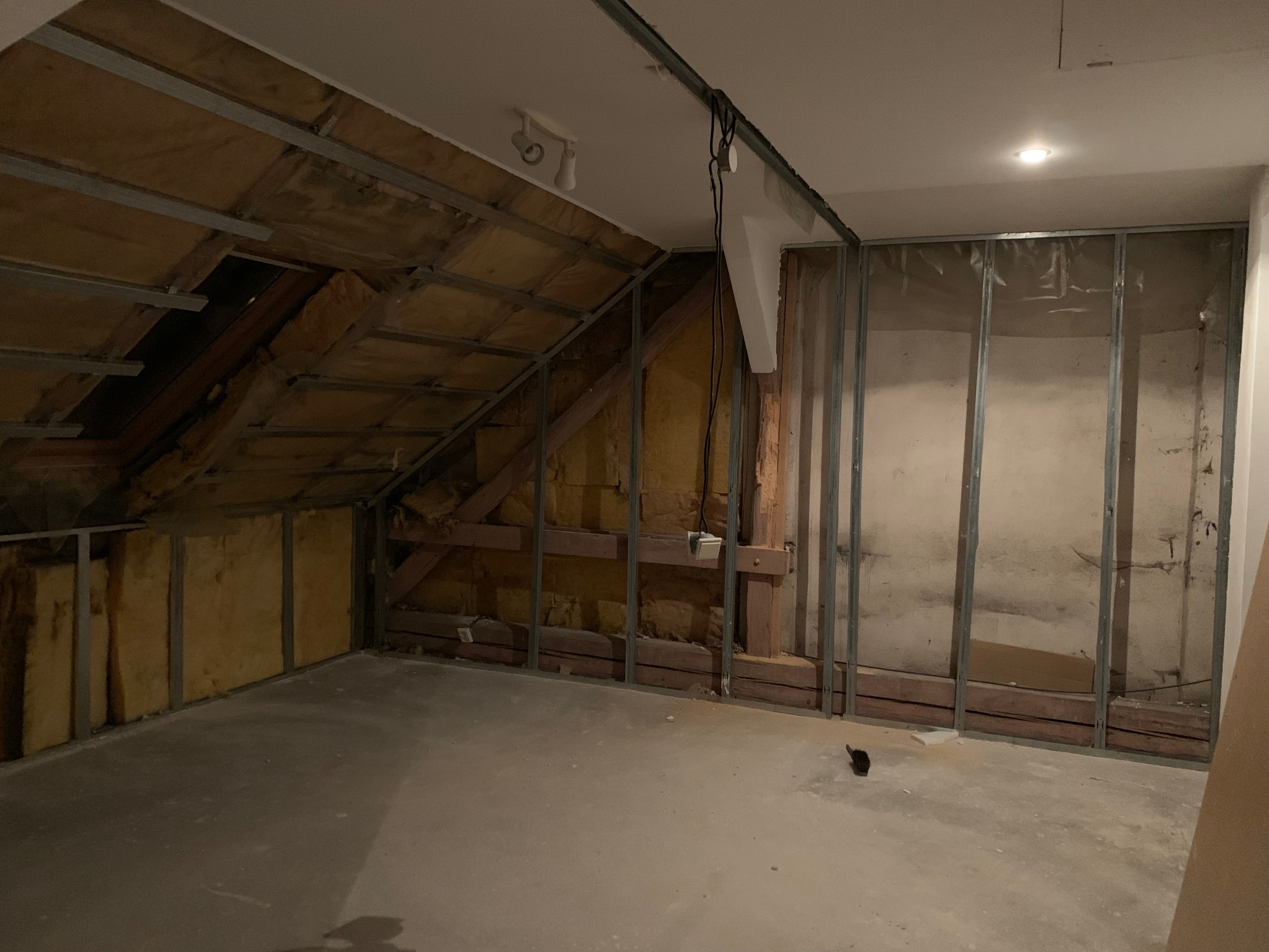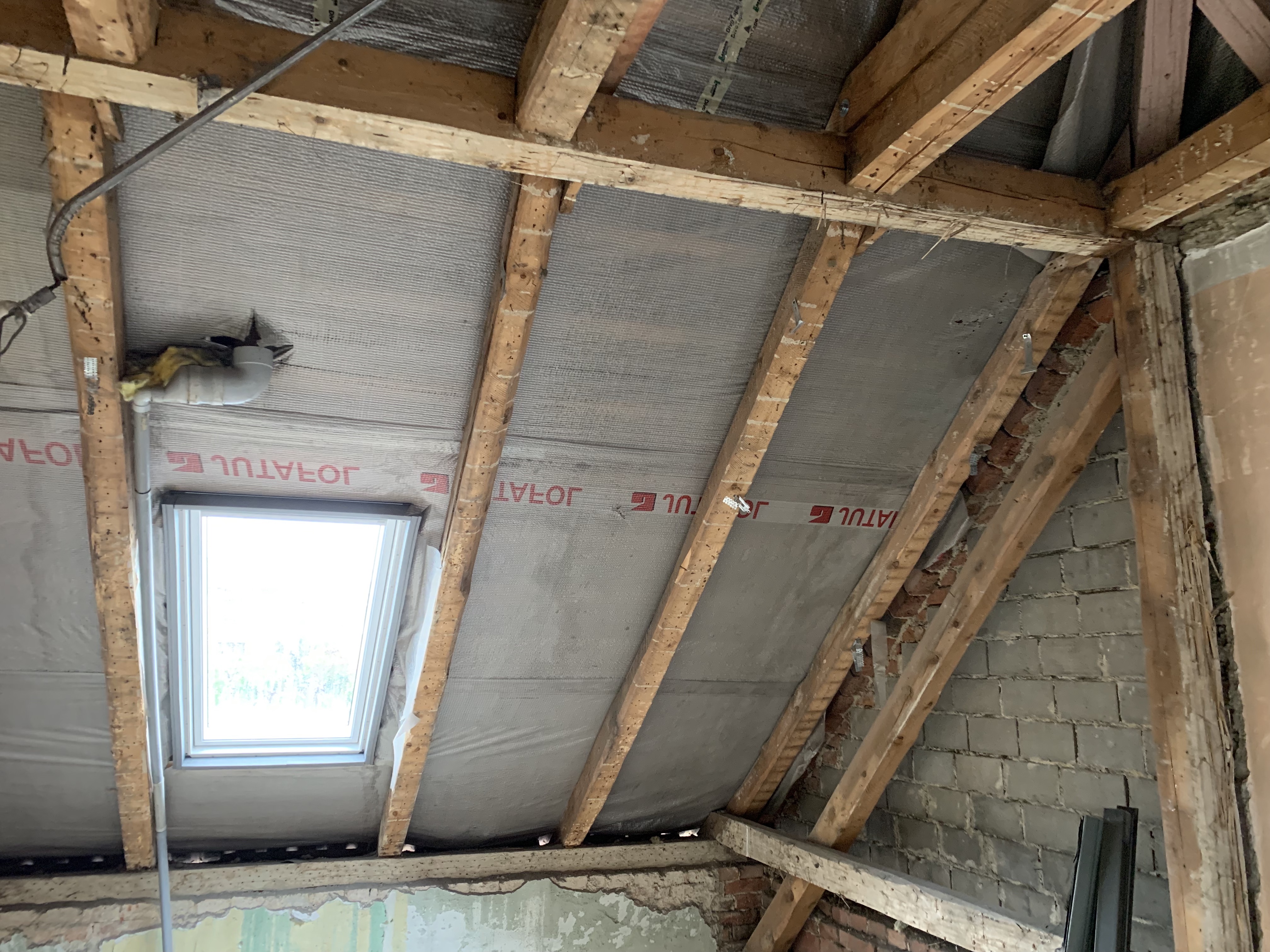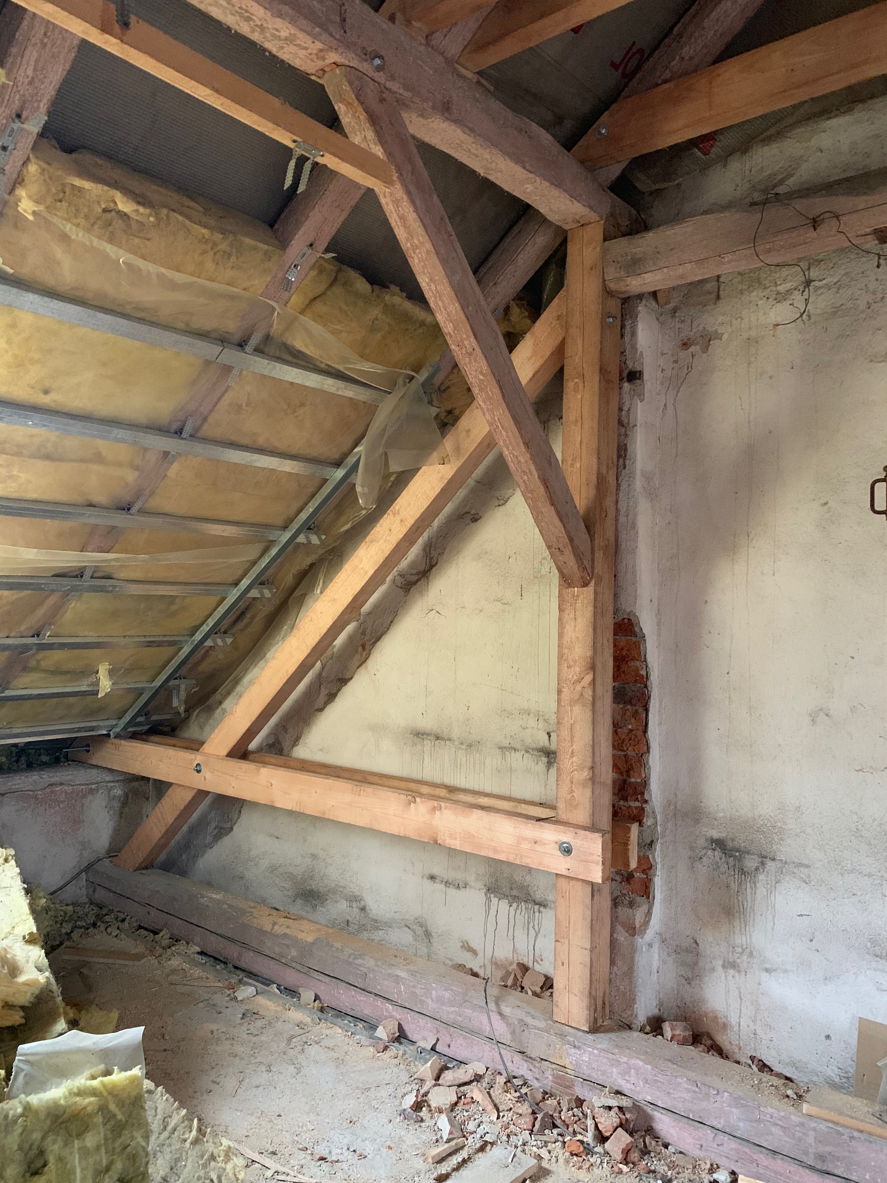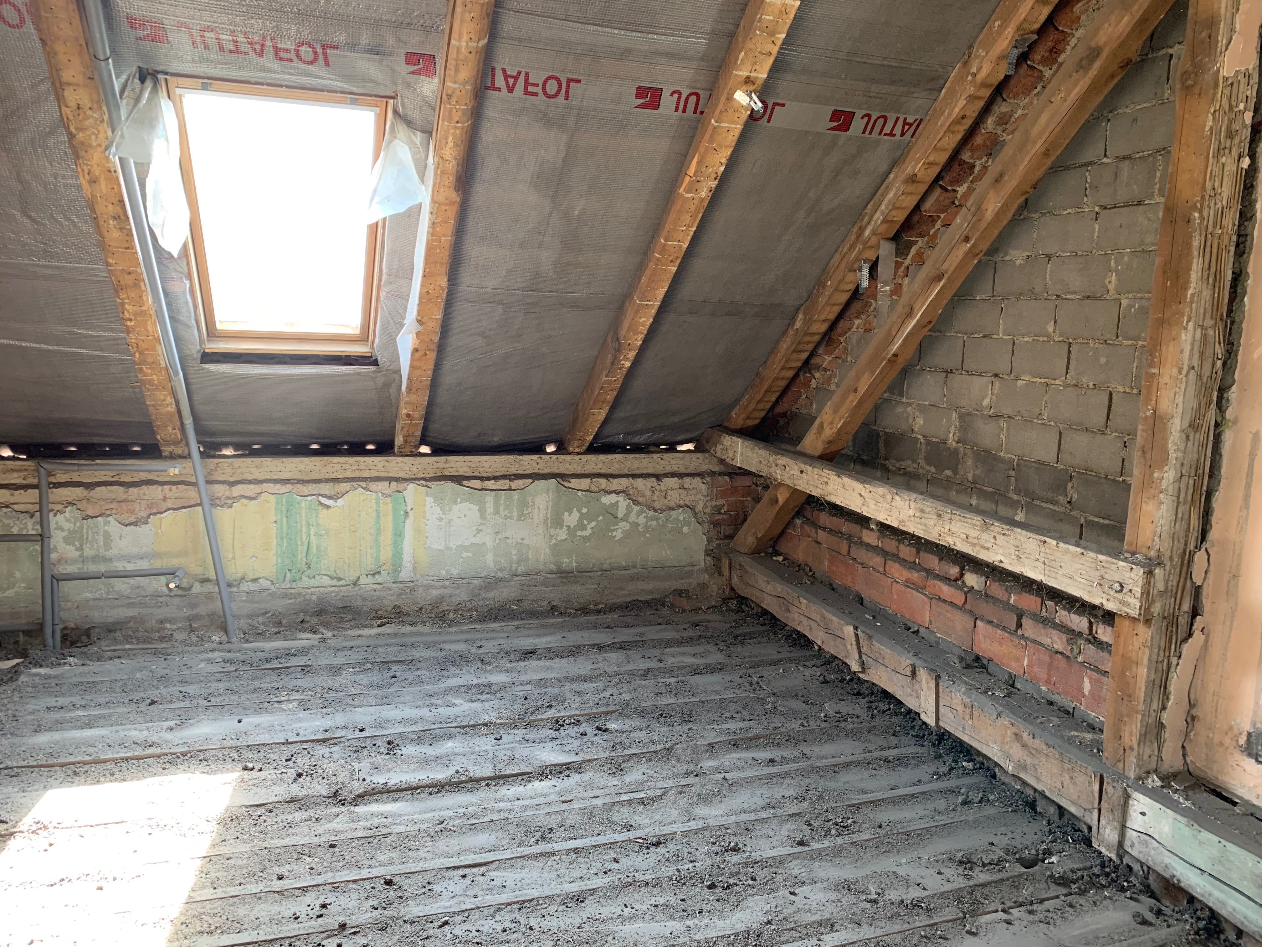 Krov na půdě, stav 1. března, po demontáži SDK vestavby je vidět svislý sloupek sežraný od brouka tesaříka (kontroloval odborník mykolog na místě). Předchozí majitelé ho jen vyztužili latí: