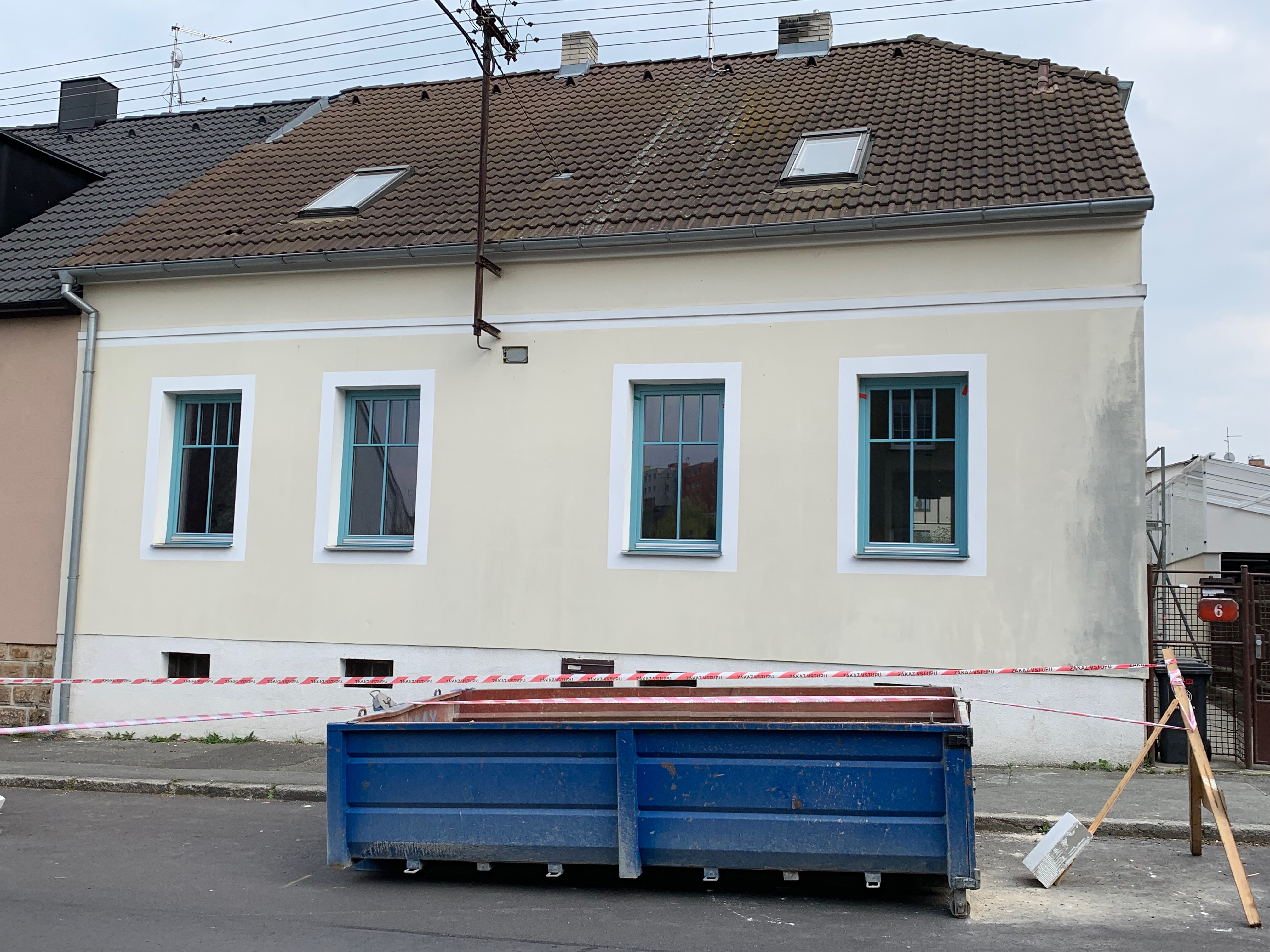 Pohled z ulice (stav 9. dubna). Je vidět konzole elektrického vedení. V roce 2020 ČEZ plánuje rekonstrukci vedení (můžeme dodat podklady), která ho přesune pod zem. Finální úpravu fasády proto odložíme, jinak by nám ji rozsekali:
