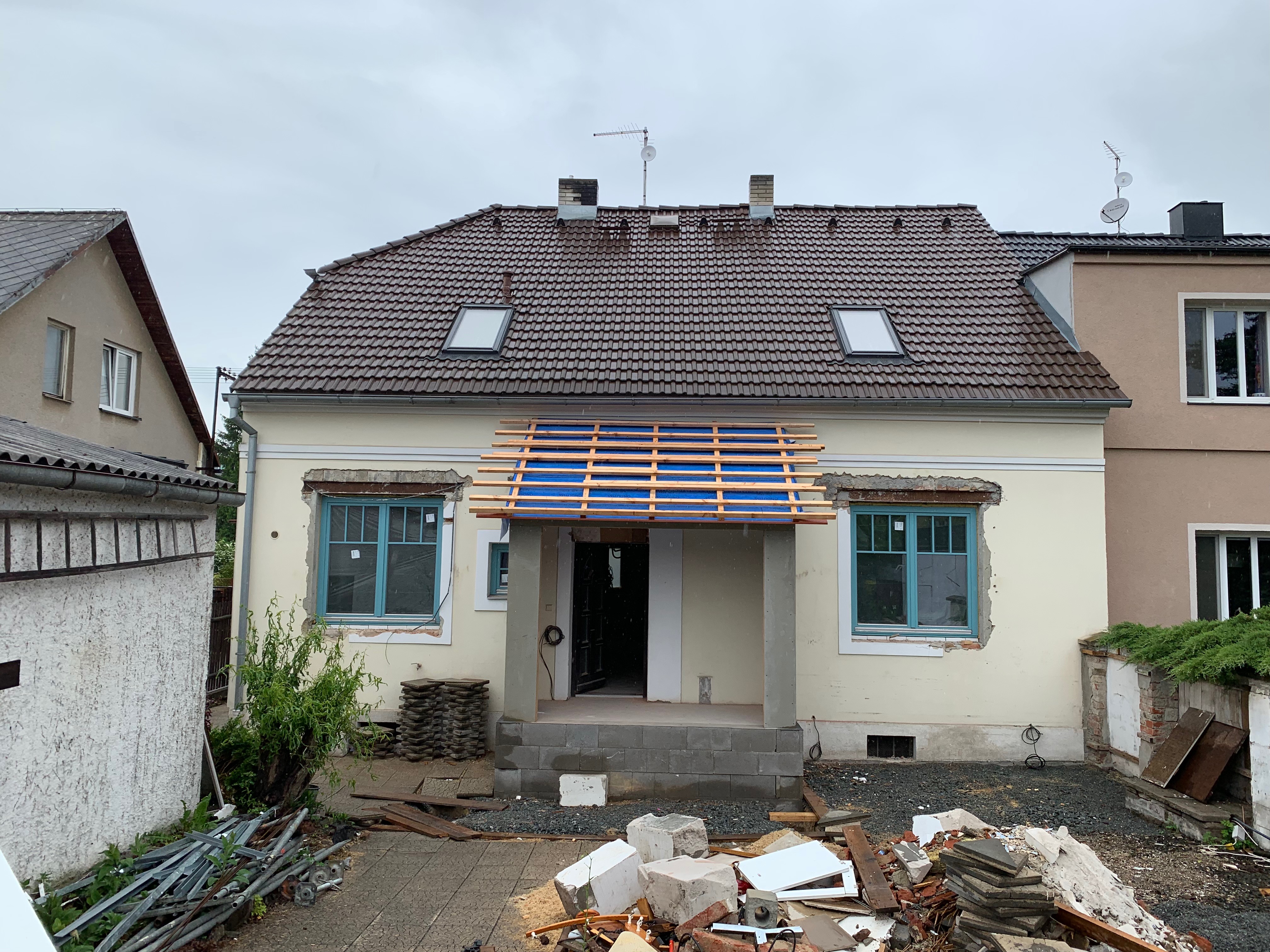 Pohled ze zahrady dnes (29. května). Střecha stále stejná, střešní okna jsou nová, ale v totožné poloze, rozměrech i vzhledu (do exteriéru):