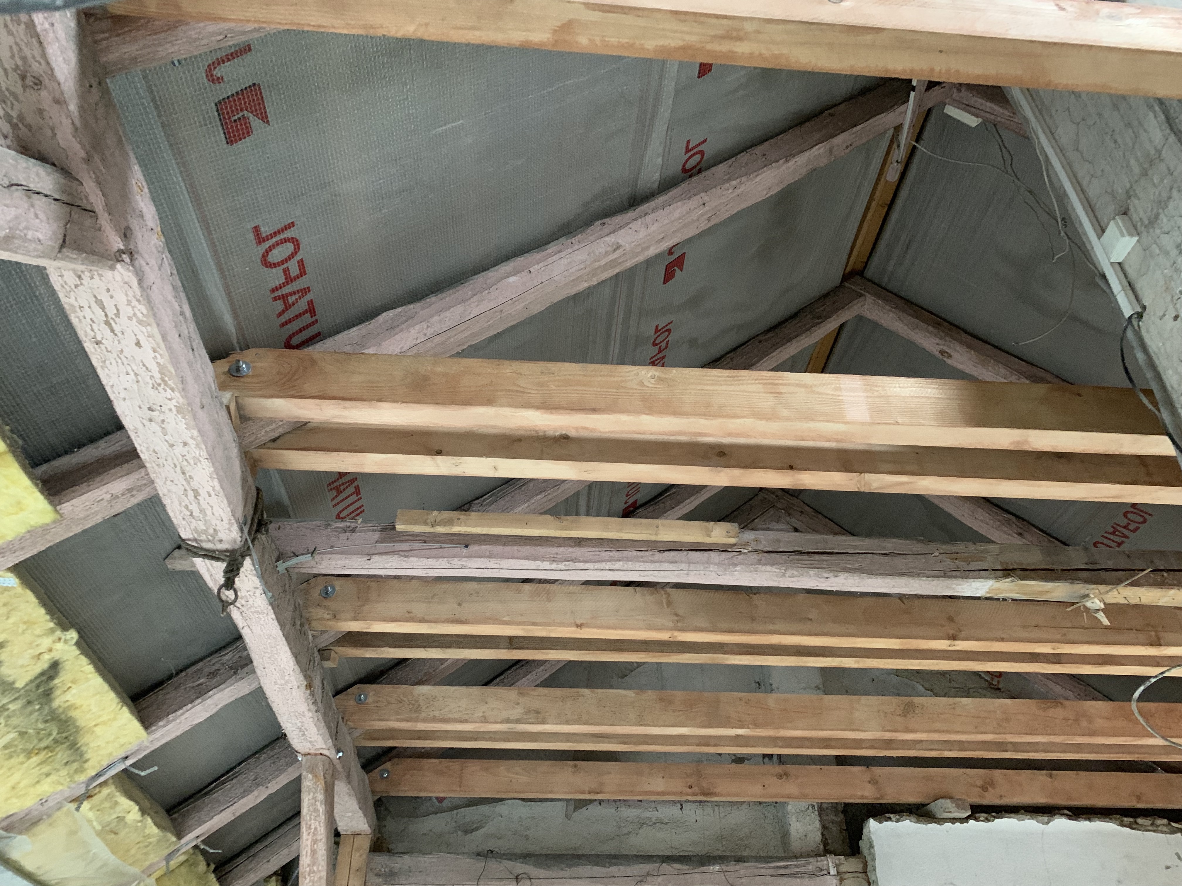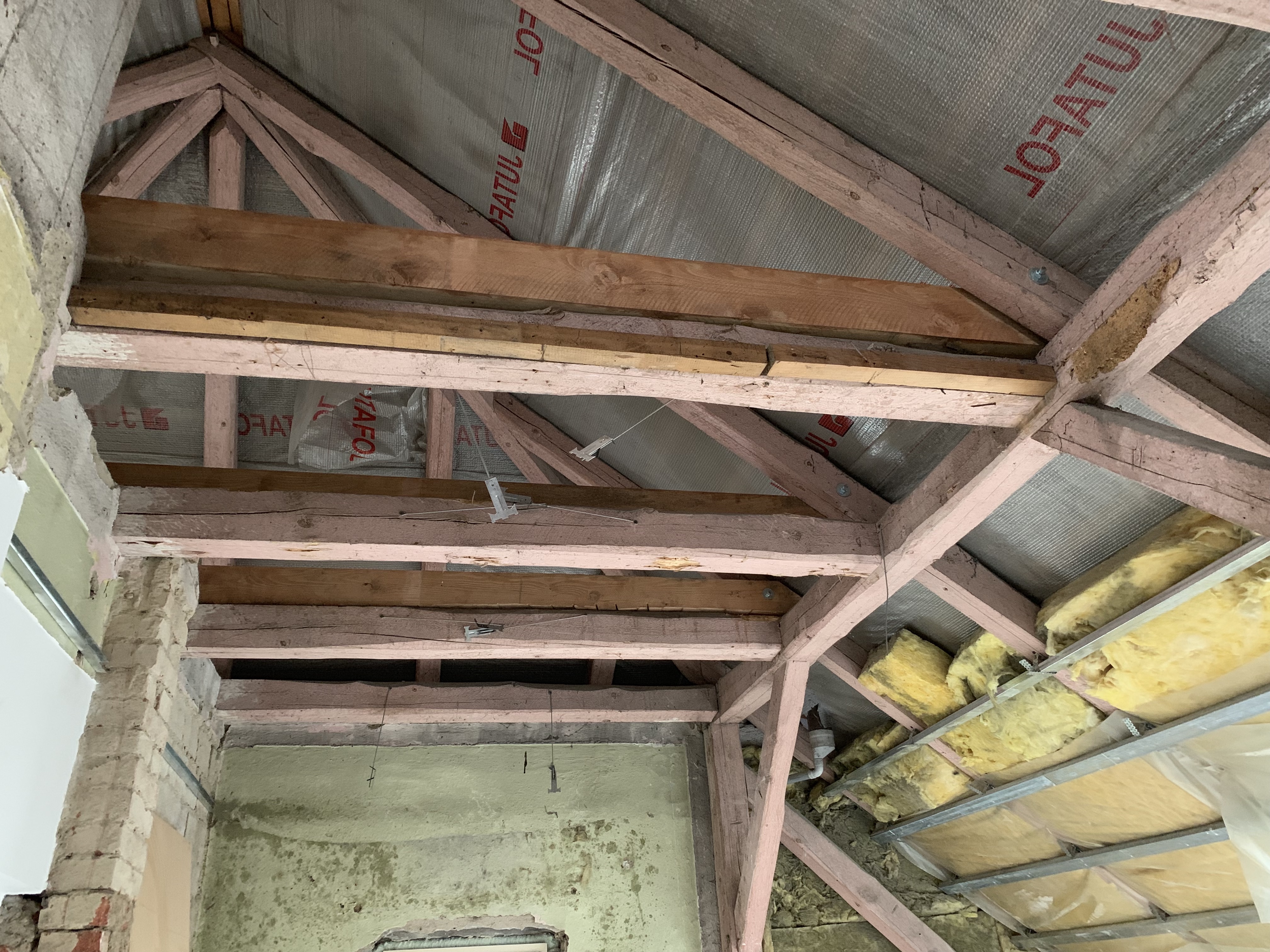Pohled na budoucí půdu. Nové vodorovné trámy (kleštiny), které budou tvořit podlahu půdy, zbytek původní: